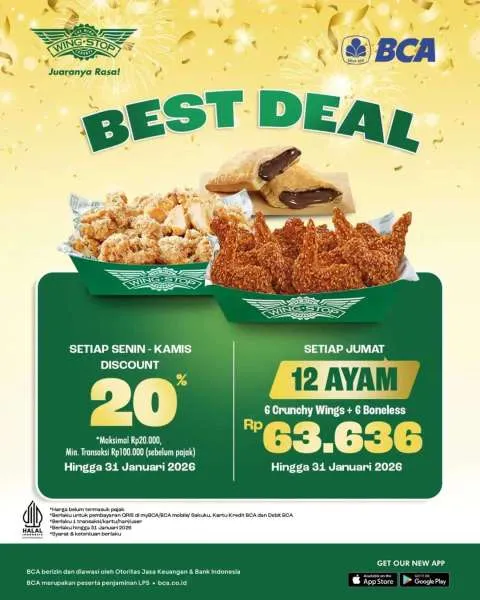 Selain itu, Wingstop juga ada promo Best Deal, khusus untuk Anda pengguna BCA. Ada penawaran spesial tiap Senin-Kamis dan tiap Jumat selama Januari 2026.