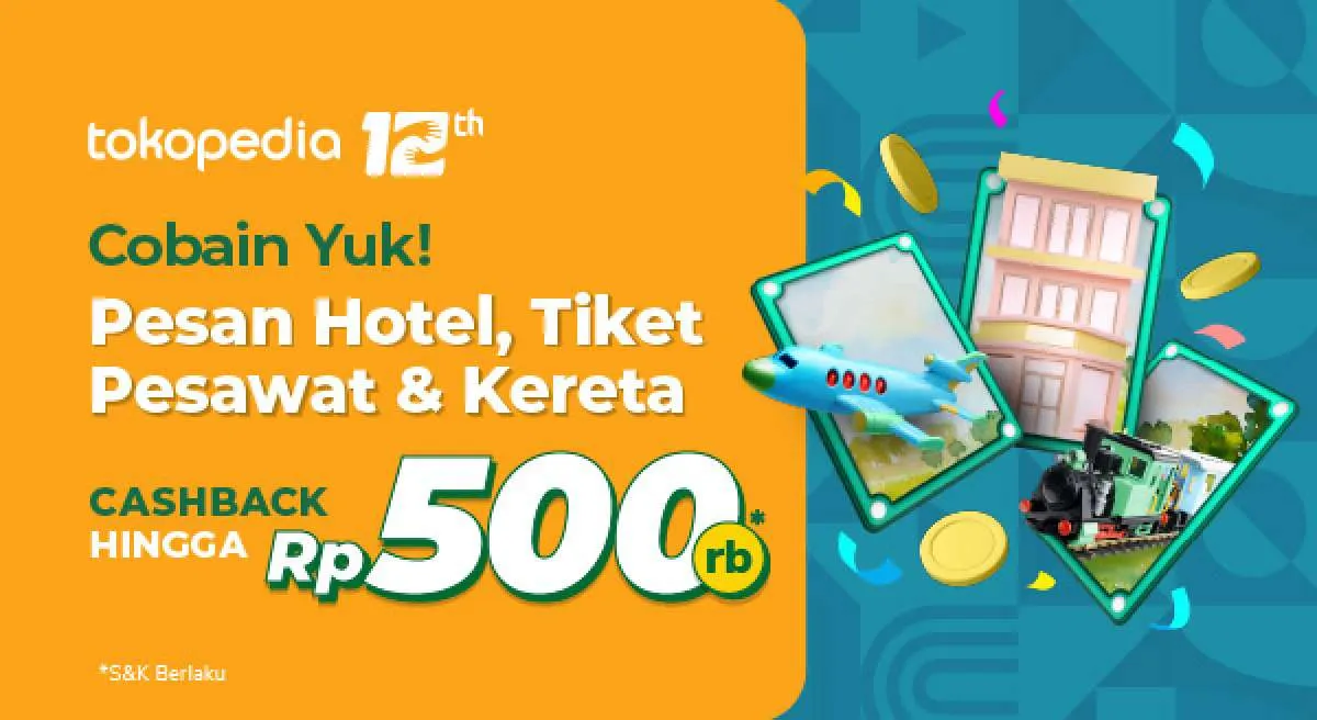 - Promo ini hanya berlaku untuk pengguna baru yang belum pernah transaksi produk Travel (Hotel, Tiket Pesawat, Tiket KAI) di Tokopedia.