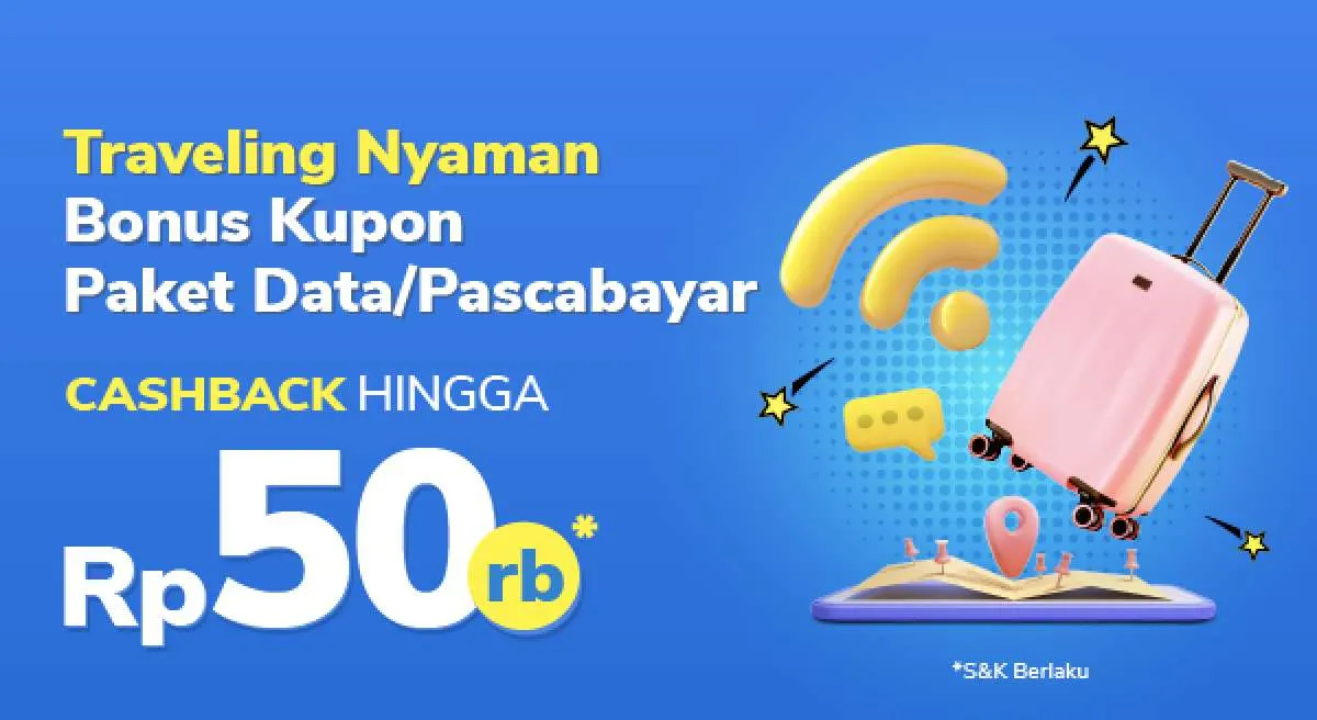 - Pengguna bisa mendapatkan 1 (satu) Kupon Paket Data/Pascabayar cashback 5% hingga Rp 50.000 dengan memasukkan kode promo: TRAVELDATA di Halaman Pembayaran.