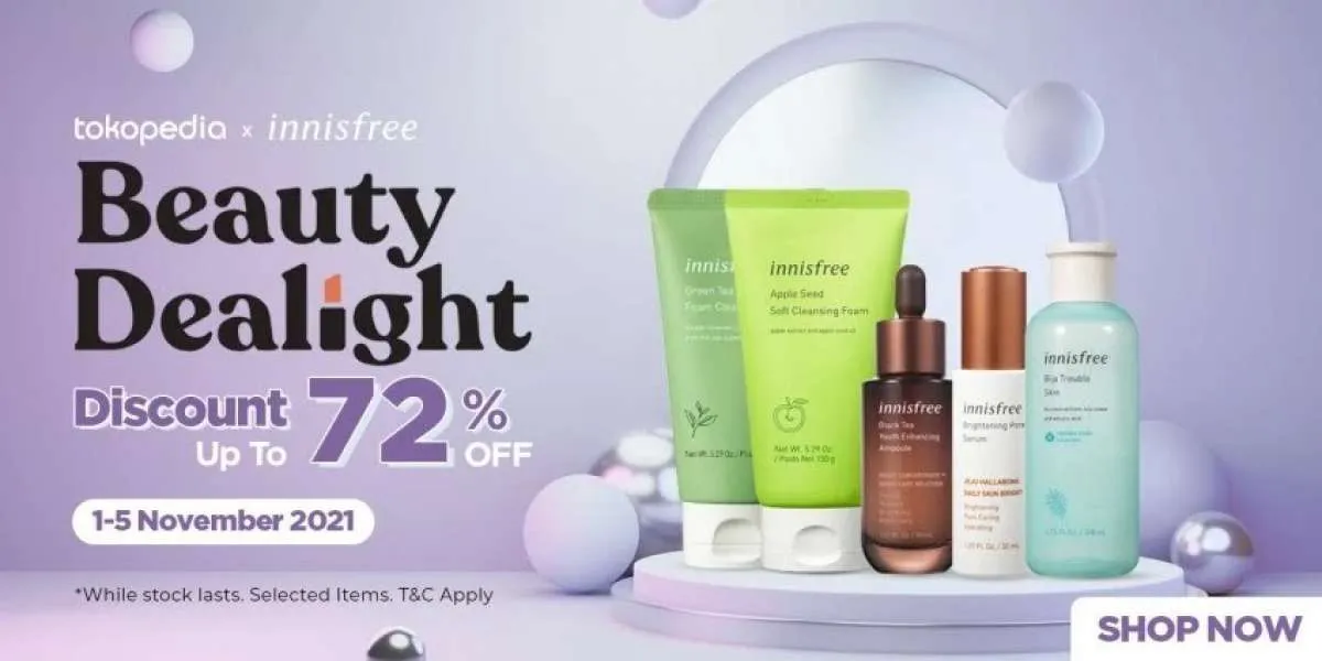 Di Tokopedia Innisfree Official Shop, sedang ada promo Tokopedia X Innisfree bernama Beauty Dealight yang berlaku 1-5 November 2021.