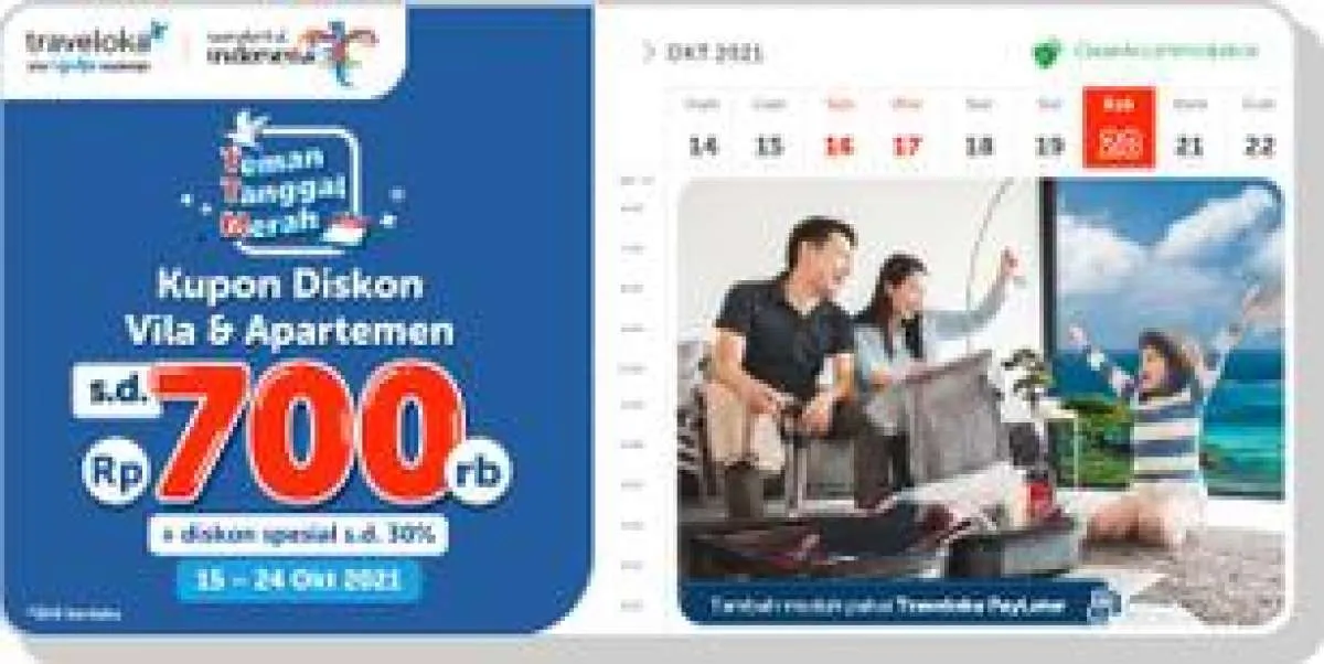 - Kupon diskon 15% sampai Rp 700,000 untuk pemesanan Vila dan Apartemen dengan transaksi minimum Rp 800.000.