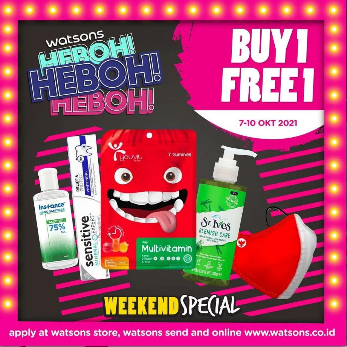 Promo Watsons Heboh! Weekend Special Buy 1 Free 1 Periode 7-10 Oktober 2021 dapat Anda nikmati di Watsons Store, Watsons Send, maupun Watsons Online.