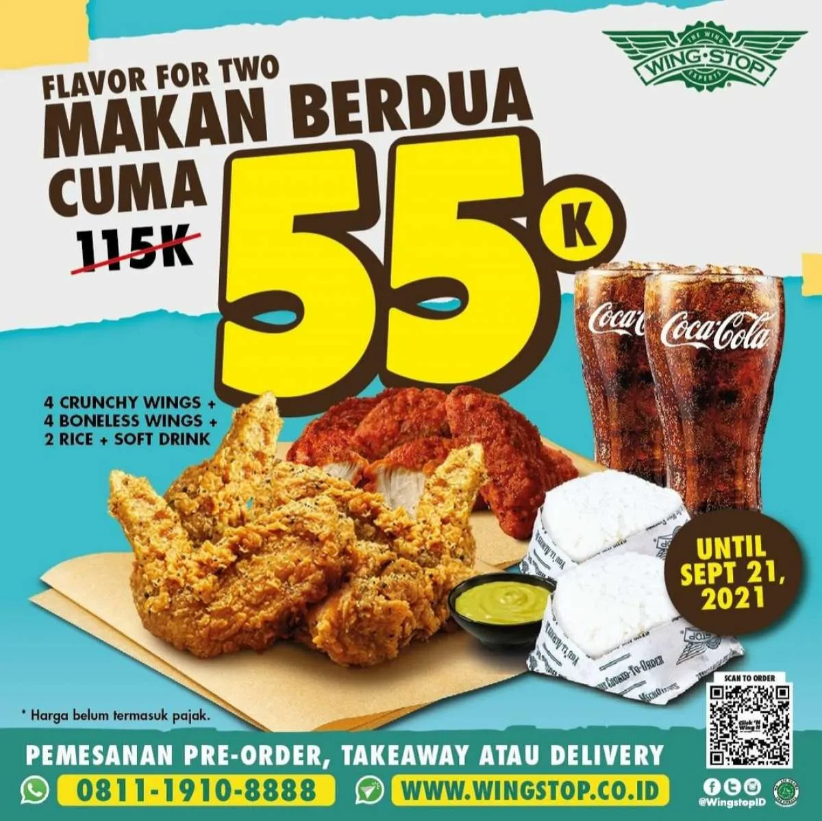 Mengutip dari Instagram Wingstop di @WingstopID, promo ini betajuk “Flavor for Two”. Pada promo kali ini, Anda bisa mendapatkan 2 paket makanan + minuman yang berisi: