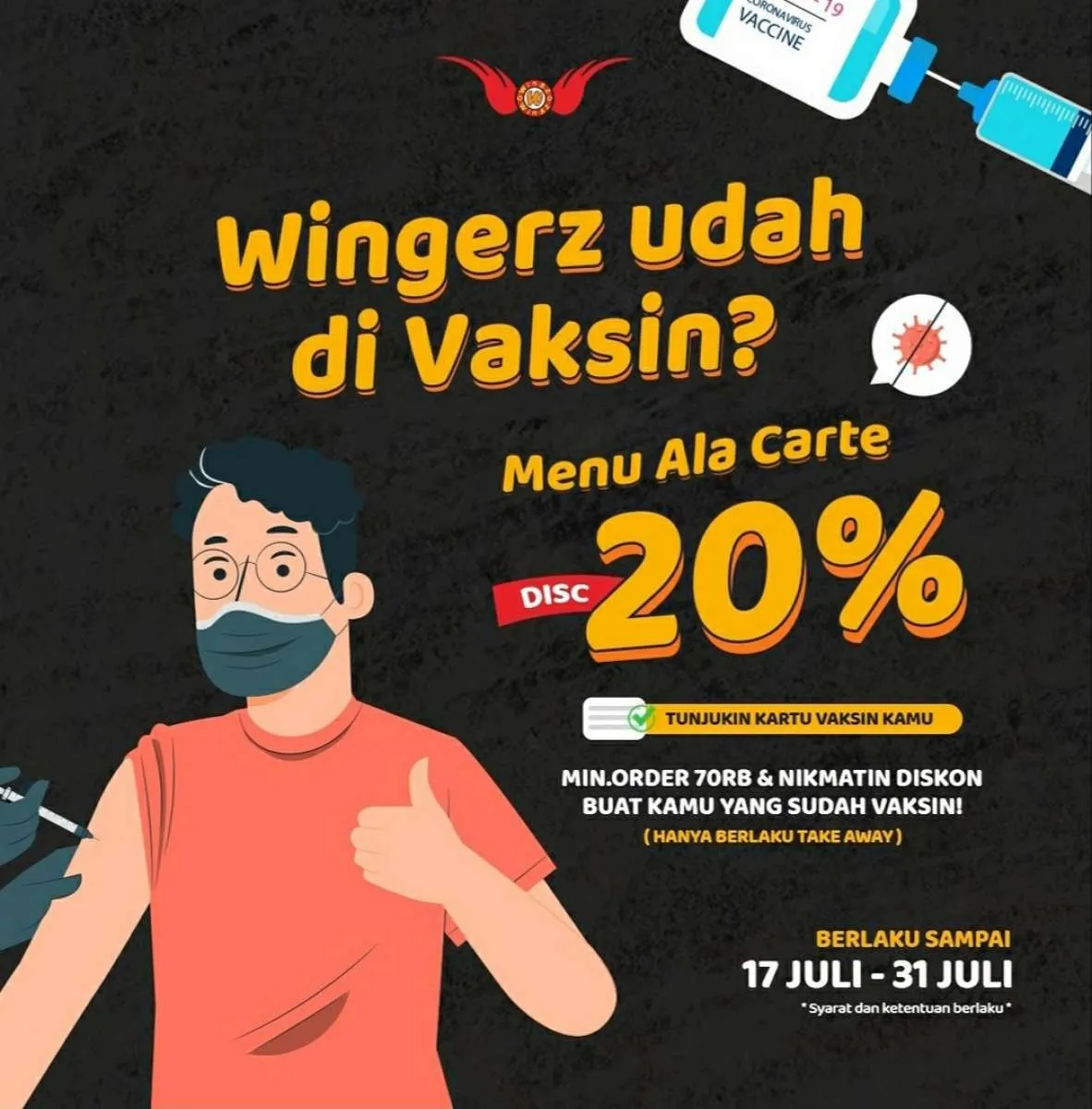 Wingz O Wingz punya promo khusus bagi Anda yang sudah divaksin, lo! Cukup tunjukkan kartu vaksin Anda baik cetak maupun digital ke petugas kasir, anda langsung bisa mendapatkan diskon 20% untuk menu Ala Carte.