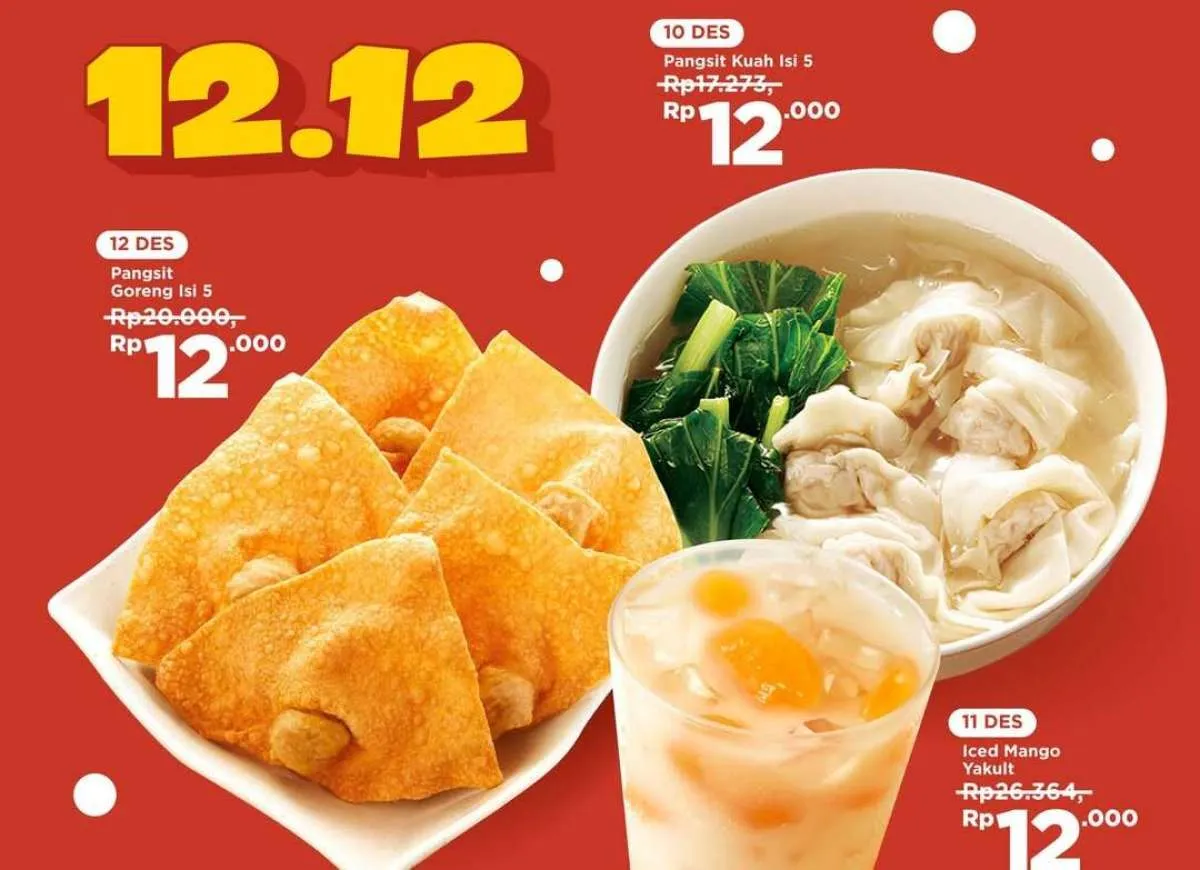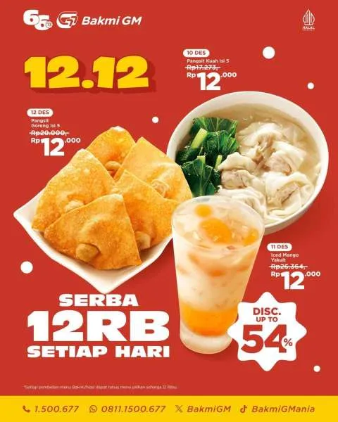 Melalui promo 12.12 kali ini, Bakmi GM menghadirkan menu spesial yang akan memanjakan Anda setiap harinya selama tiga hari. Mulai dari seporsi Pangsit Kuah yang gurih nikmat sampai Iced Mango Yakult yang segar.