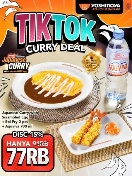 Selain itu, Anda juga bisa menikmati promo TikTok di Yoshinoya. Ada diskon 15% untuk menikmati Japanese Curry with Scrambled Egg yang sudah lengkap dengan minum juga.