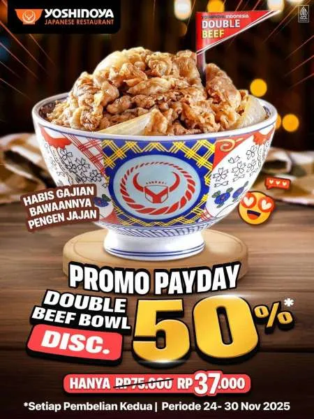 MOMSMONEY.ID - Pas gajian jangan lupa mampir di Yoshinoya ya! Karena ada promo Yoshinoya Payday untuk menikmati Double Beef Bowl spesial dengan diskon sampai 50% yang berlaku sampai akhir November 2025 saja.