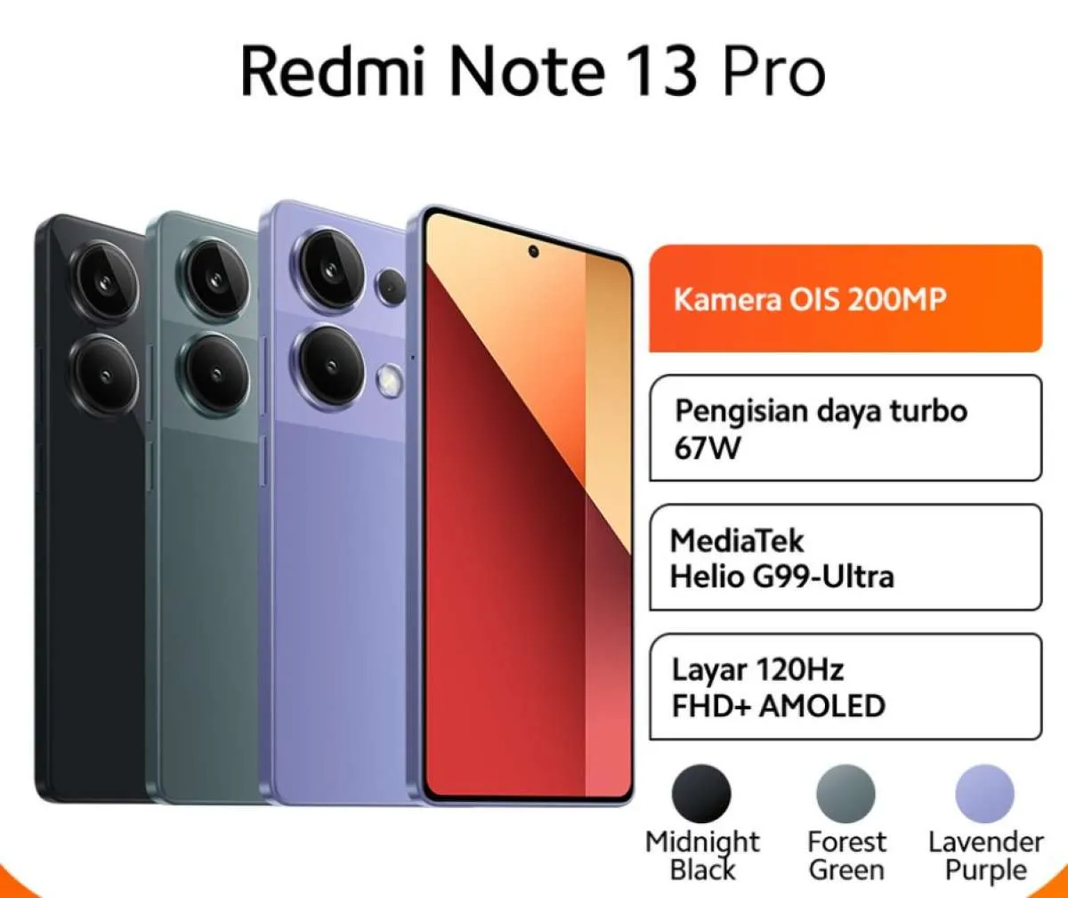Xiaomi menawarkan Redmi Note 13 Pro dalam warna hitam dan ungu muda.