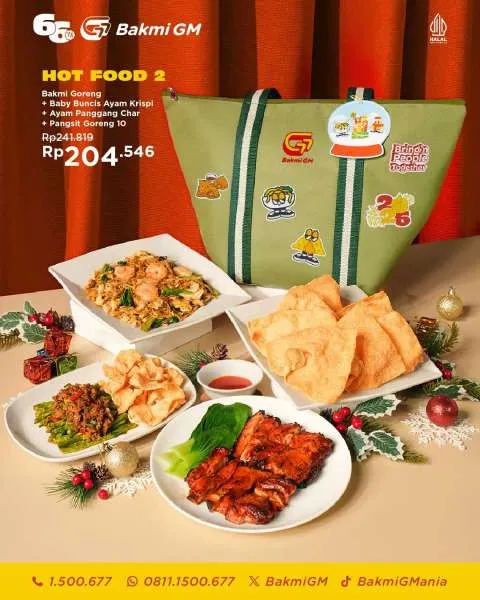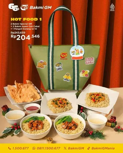 - Hot Food 1 (Rp 204.546): 2 Bakmi Special GM + 2 Bakmi Ayam Cah Cabai + 1 Pangsit Goreng Isi 10