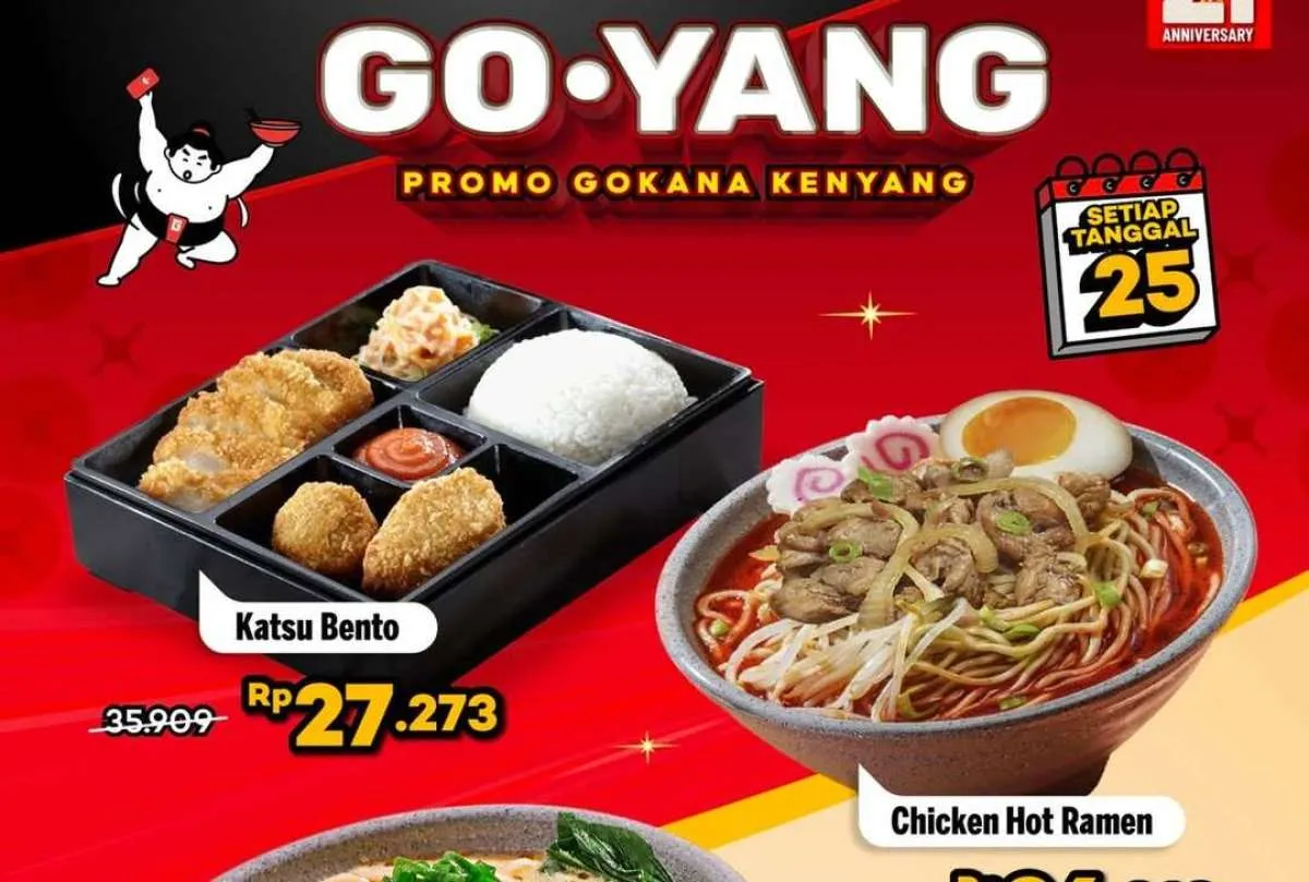MOMSMONEY.ID - Nikmati Bento atau Ramen favorit dengan diskon 25% setiap tanggal 25 dengan promo Gokana Kenyang (Goyang). Menu-menunya best seller lo. Jadi, sayang banget kalau sampai kelewatan.