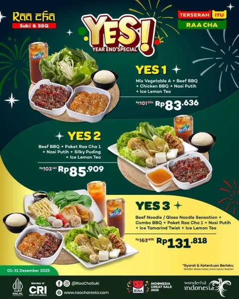 Selain itu, Raa Cha juga ada promo YES! (Year End Speciial) selama Desember 2025. Tersedia paket menu yang siap manjakan Anda mulai dari harga Rp 83.000-an saja.
