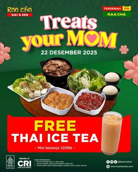 MOMSMONEY.ID - Rayakan momen Hari Ibu dengan cara sederhana namun penuh makna. Khusus 22 Desember, Anda bisa menikmati promo Raa Cha spesial Hari Ibu untuk menikmati menu favorit dan dapatkan Thai Ice Tea gratis.