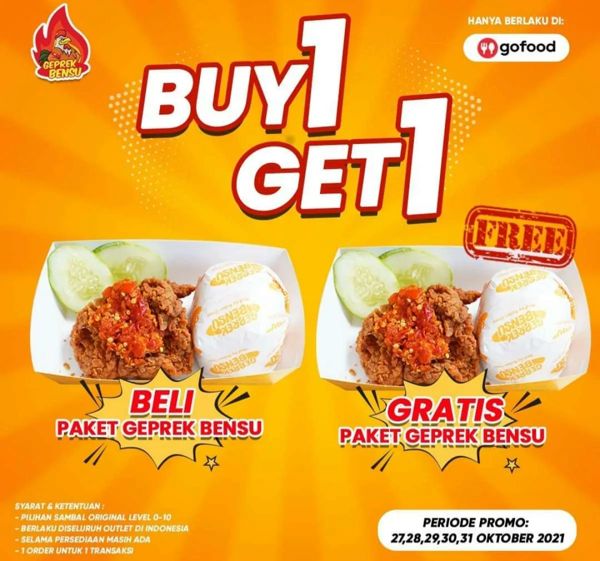Promo Geprek Bensu Buy 1 Get 1 berlaku di seluruh Indonesia selama periode 27-31 Oktober 2021.